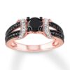 A traditional engagement ring that boldly tosses aside all the usual traditions. A round black diamond resides in the center, completed by two curves decorated in white diamonds. Black diamonds edge the 10K rose gold band to complete the look. The ring has a total diamond weight of 1 carat. Black diamonds are treated to permanently create the intense black color.Item #: 992787109Content + CareColor diamonds pictured have been treated to permanently create the intense colors. Proper care is required in jewelry repair as excessive heat can damage diamonds and gemstones.